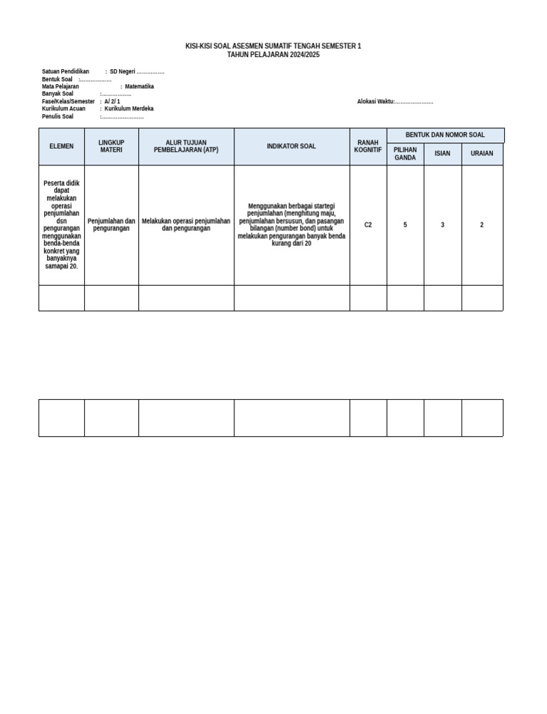 Alokasi Waktu (Opsional tapi Disarankan): Meskipun tidak selalu ada dalam format baku, alokasi waktu per soal atau per indikator dapat membantu dalam perencanaan ujian yang efisien.