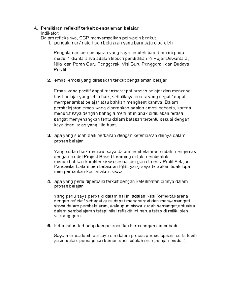 Definisi Refleksi: Refleksi adalah proses mental yang melibatkan pemikiran mendalam tentang suatu pengalaman, kejadian, atau informasi. Dalam konteks pembelajaran, refleksi membantu peserta didik untuk menghubungkan pengalaman dengan pengetahuan yang sudah dimiliki, mengidentifikasi kesenjangan, dan merumuskan pemahaman baru.